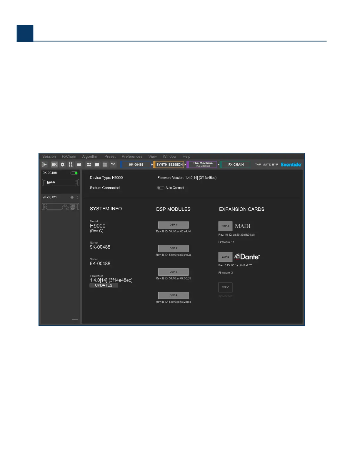 rmware version, number of installed DSP modules, types of expansion cards and their rmware