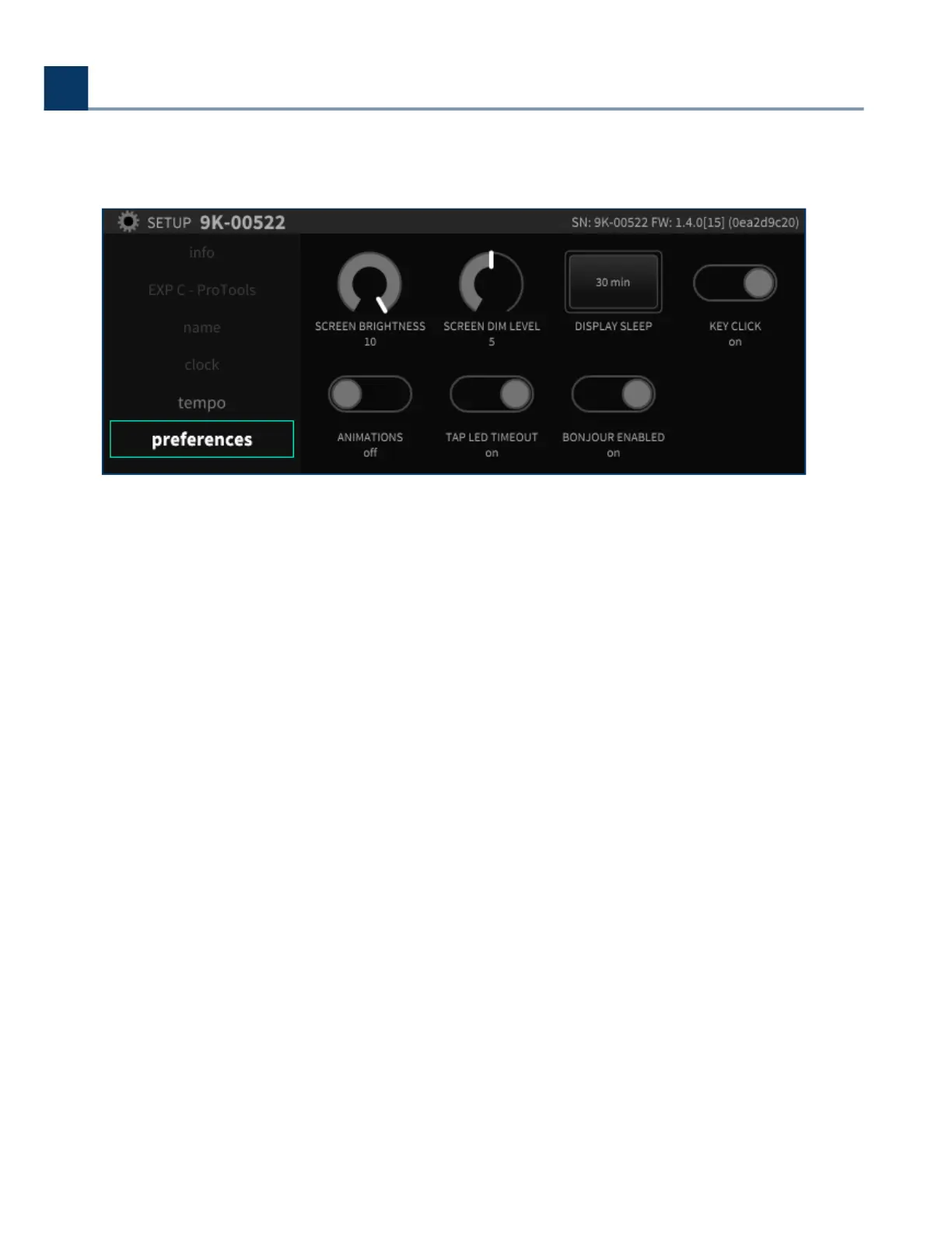 The Preferences section controls various aspects of the H9000’s display. Use the cursor keys to