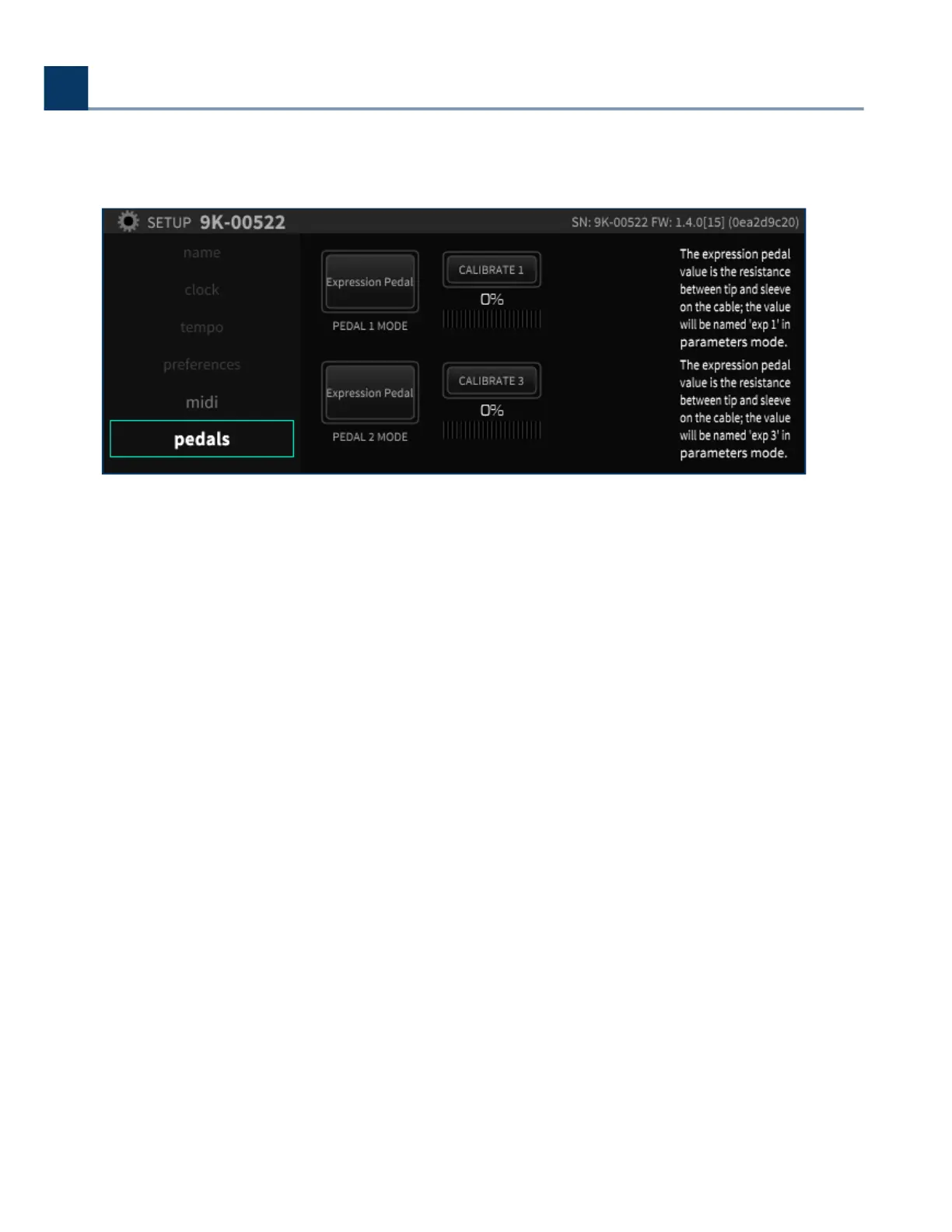 The Pedals setup page allows you to congure your unit for a wide variety of dierent types of pedals