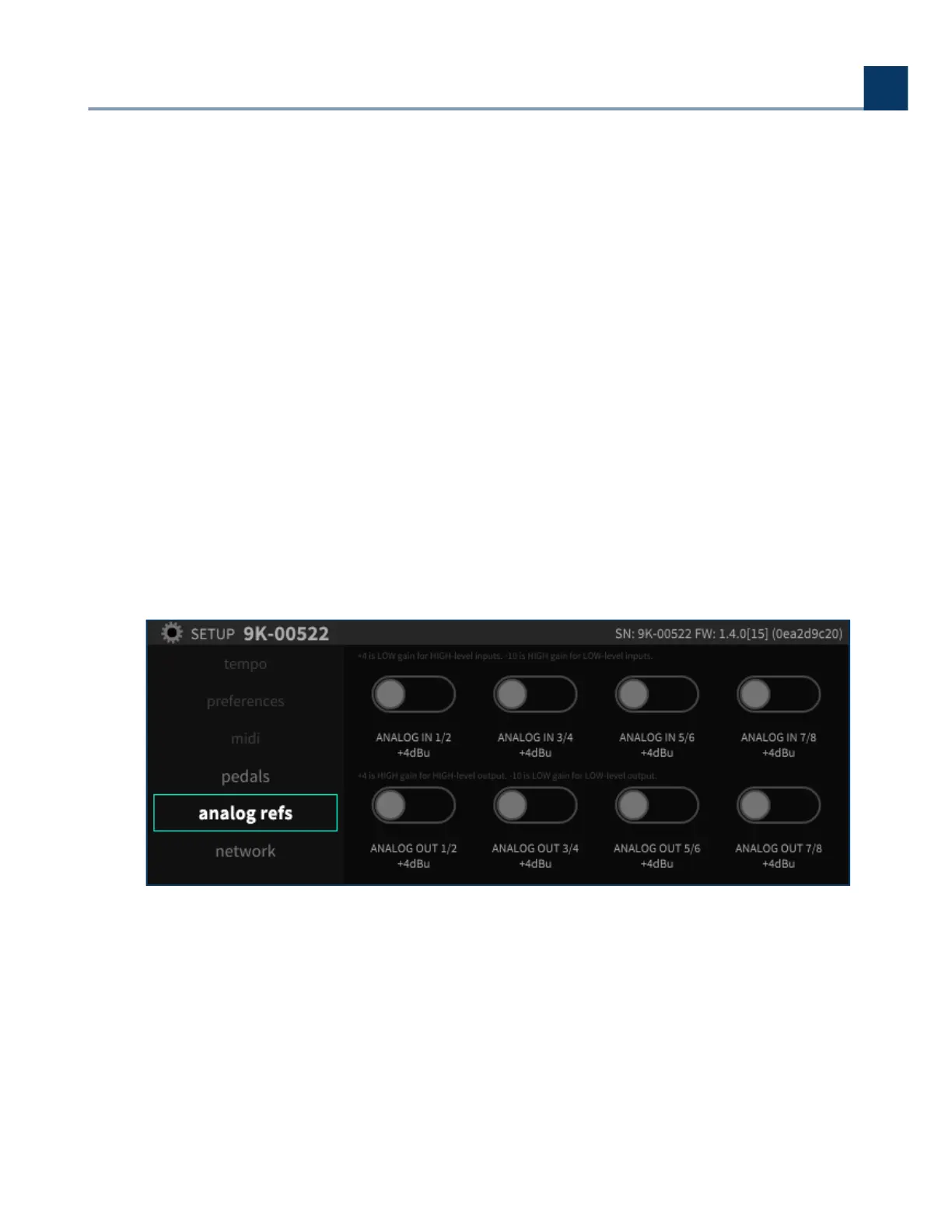 The Analog Reference Levels screen allows you to set the levels for the eight analog inputs and