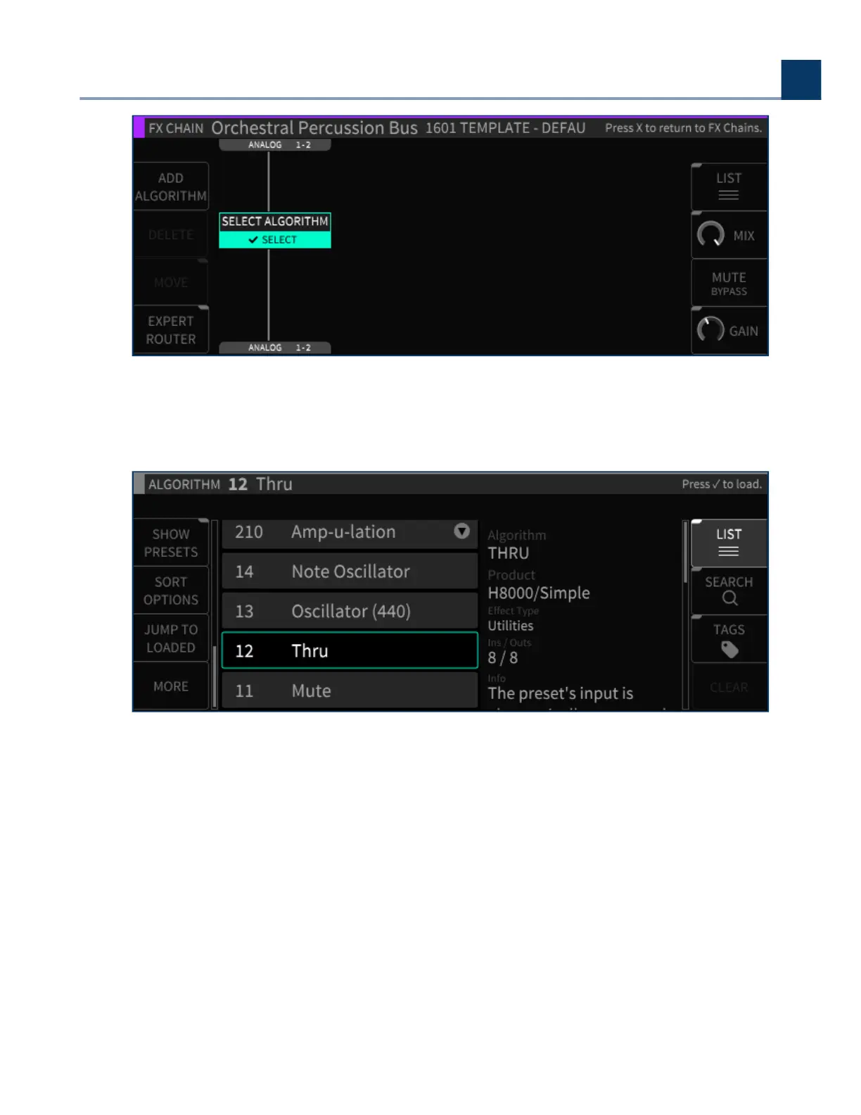 Press the latching Move sot key to change the location of an algorithm within the FX chain. You can