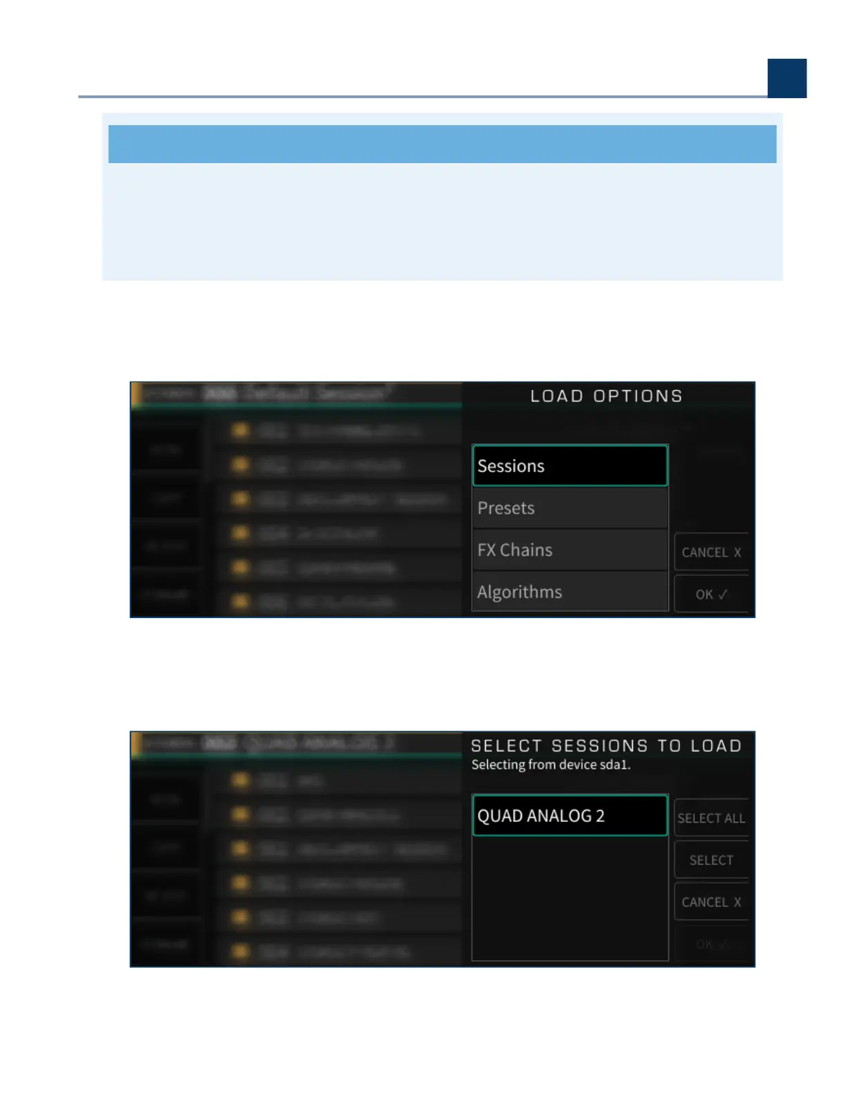 Use the cursor up/down keys or wheel to select the data you wish to load, then press the SELECT key;