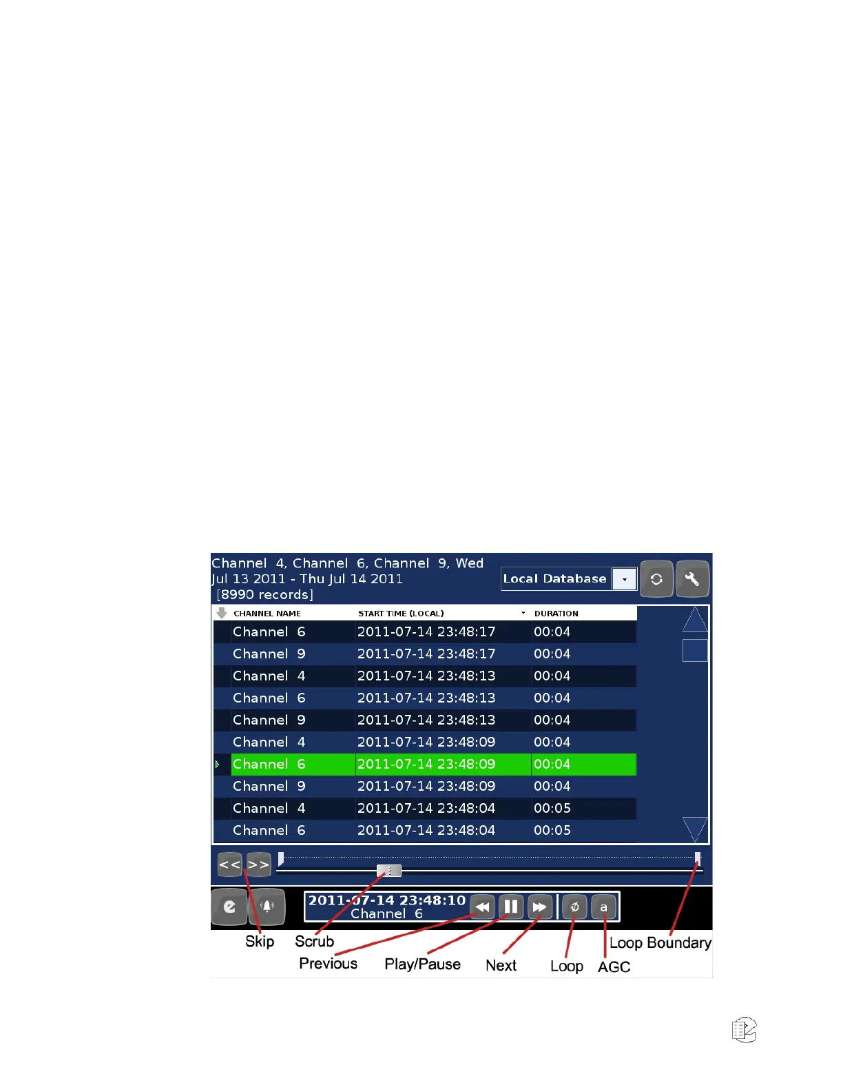 3. Click any row to begin playback of a single recording at a time.