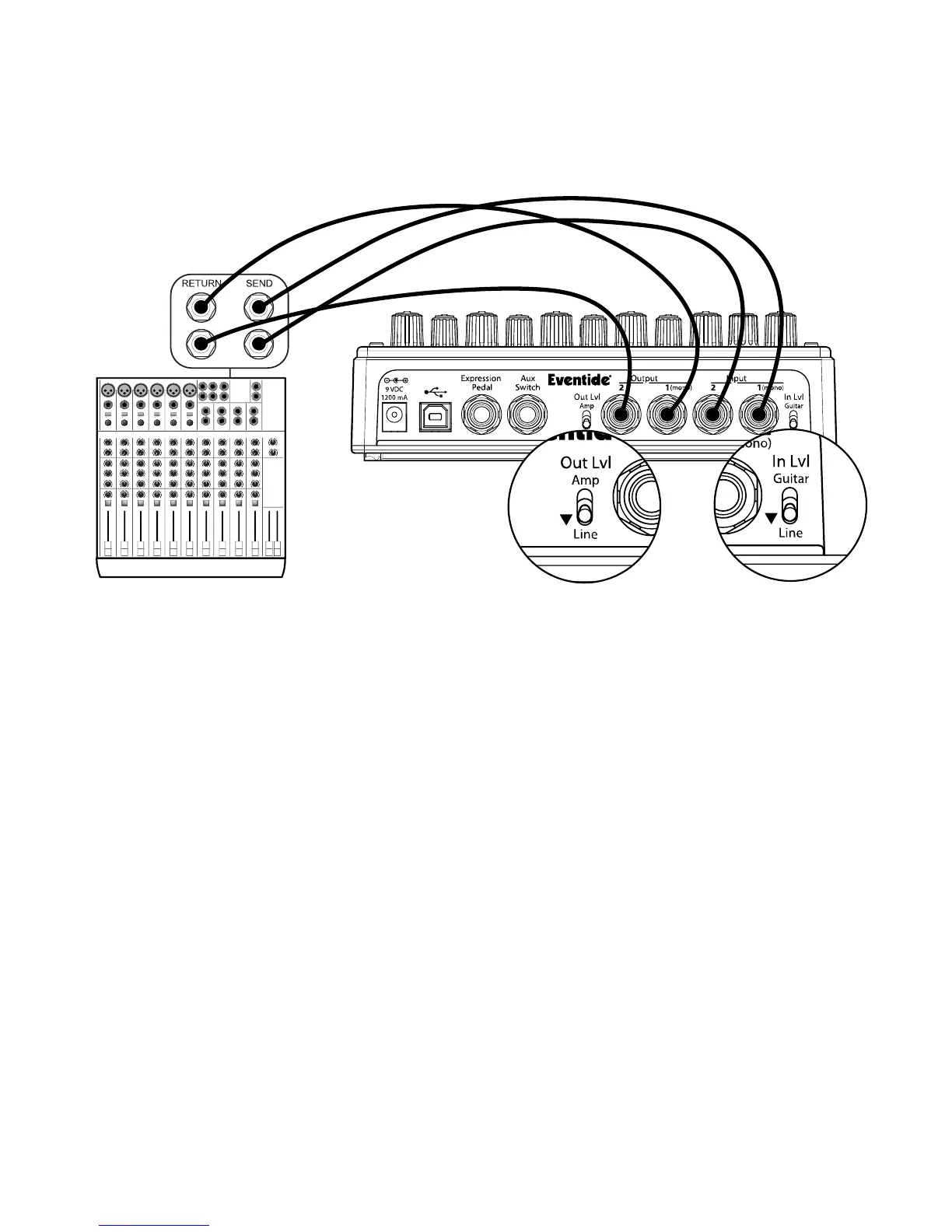 When connecting TimeFactor to a Mixer, set TimeFactor’s Input and Output Level Switches to