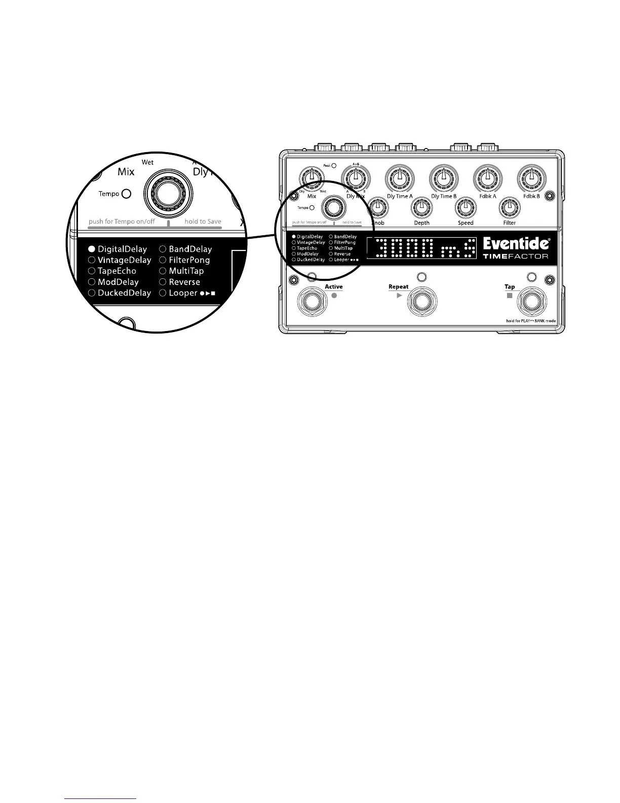The nine delay Effects and the Looper can be selected by turning the Encoder. Using the