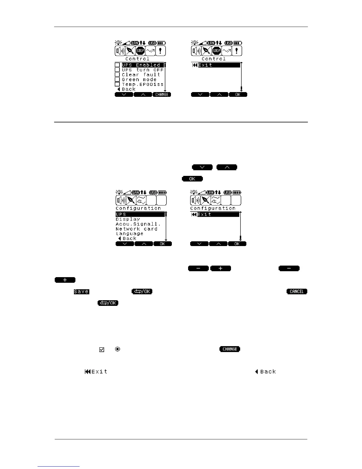 the CONFIGURATION submenu to the default information screen UPS STATUS