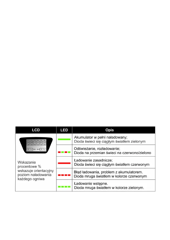 baterii (wszystkie segmenty pełne) oraz zapala się zielona dioda. W przypadku akumulatorów