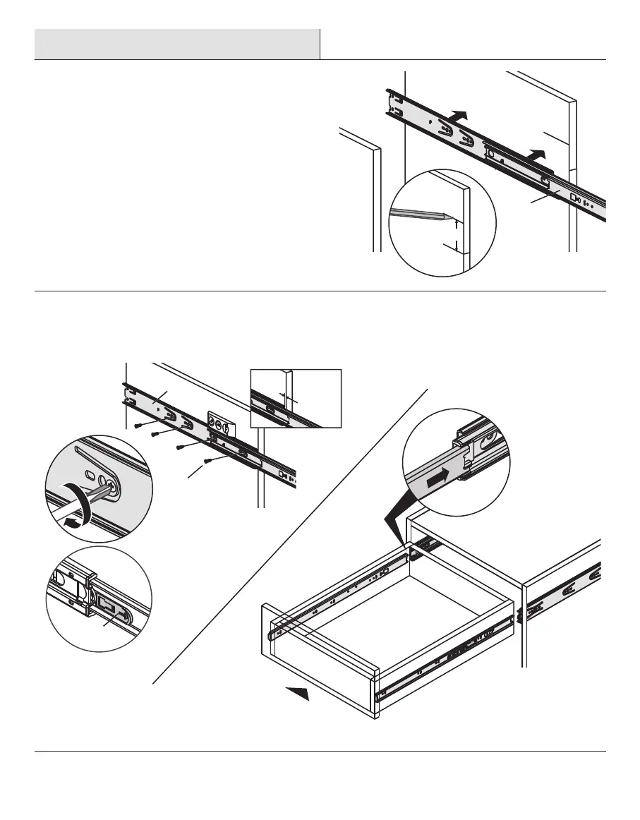Make sure each bracket (A) is level and secure inside the cabinet with screws (C). Insert the drawer into the cabinet and close.