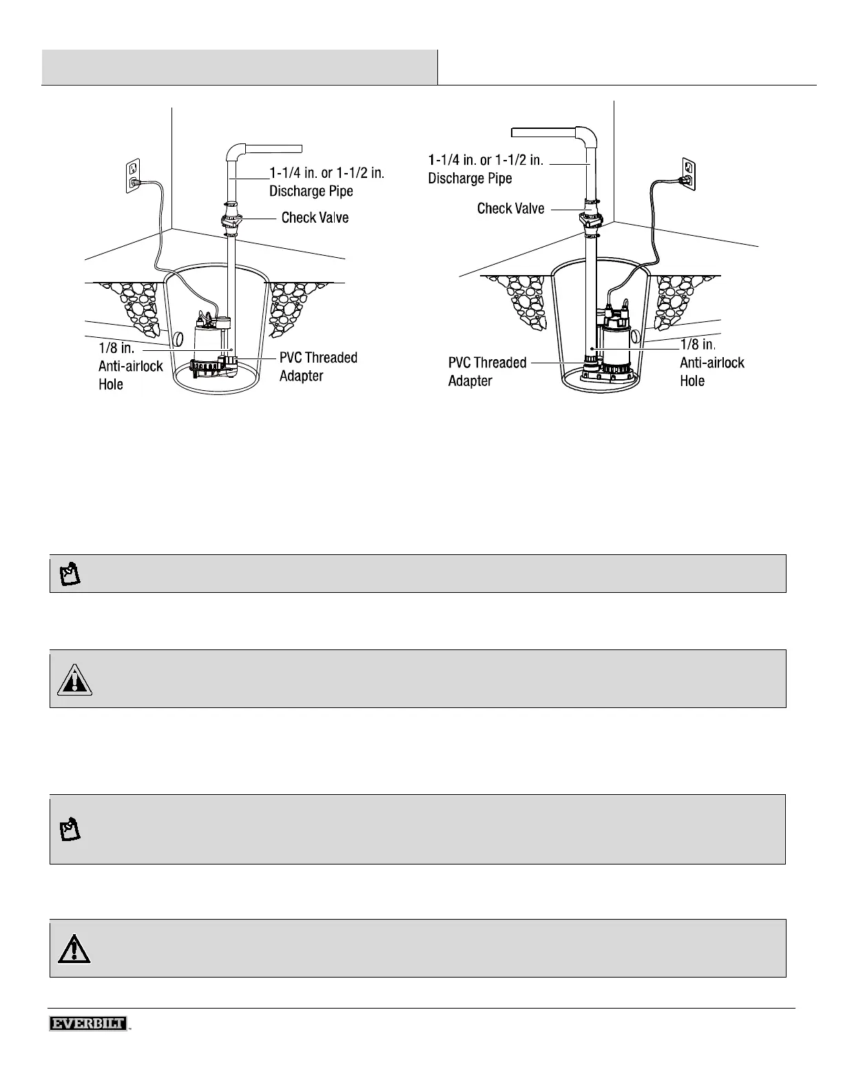 3. The pump should not be installed on clay, earth or sand surfaces. Clean the sump pit of small stones and gravel which could clog the