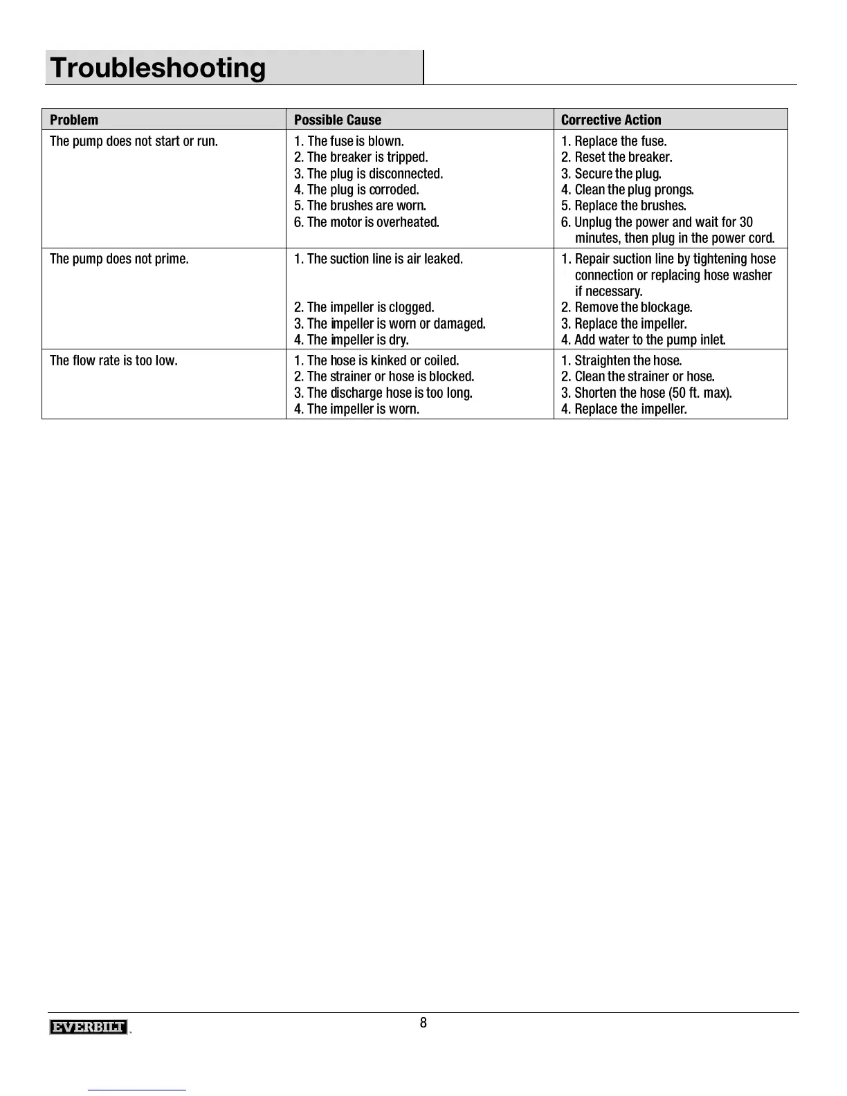 Everbilt ZE00802A - Troubleshooting Guide; Pump Fails to Start or Run; Pump Fails to Prime; Low Water Flow Rate