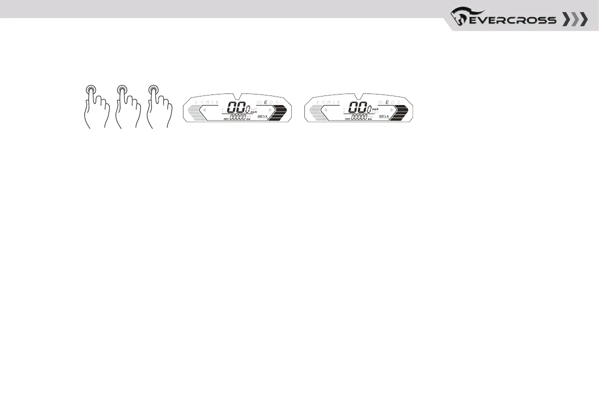 • Click the button for 3 times to switch display of speedometer km/h / mph.