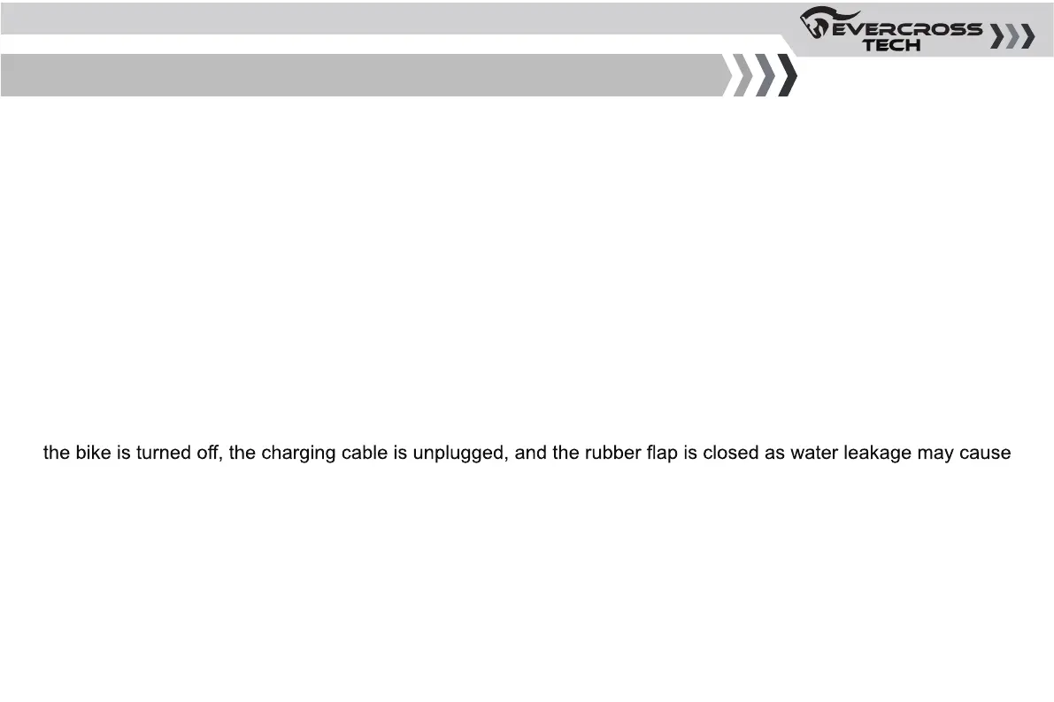 • EVERCORSS TECH Electric Bikes are not waterproof and should not be submerged in water as this may damage