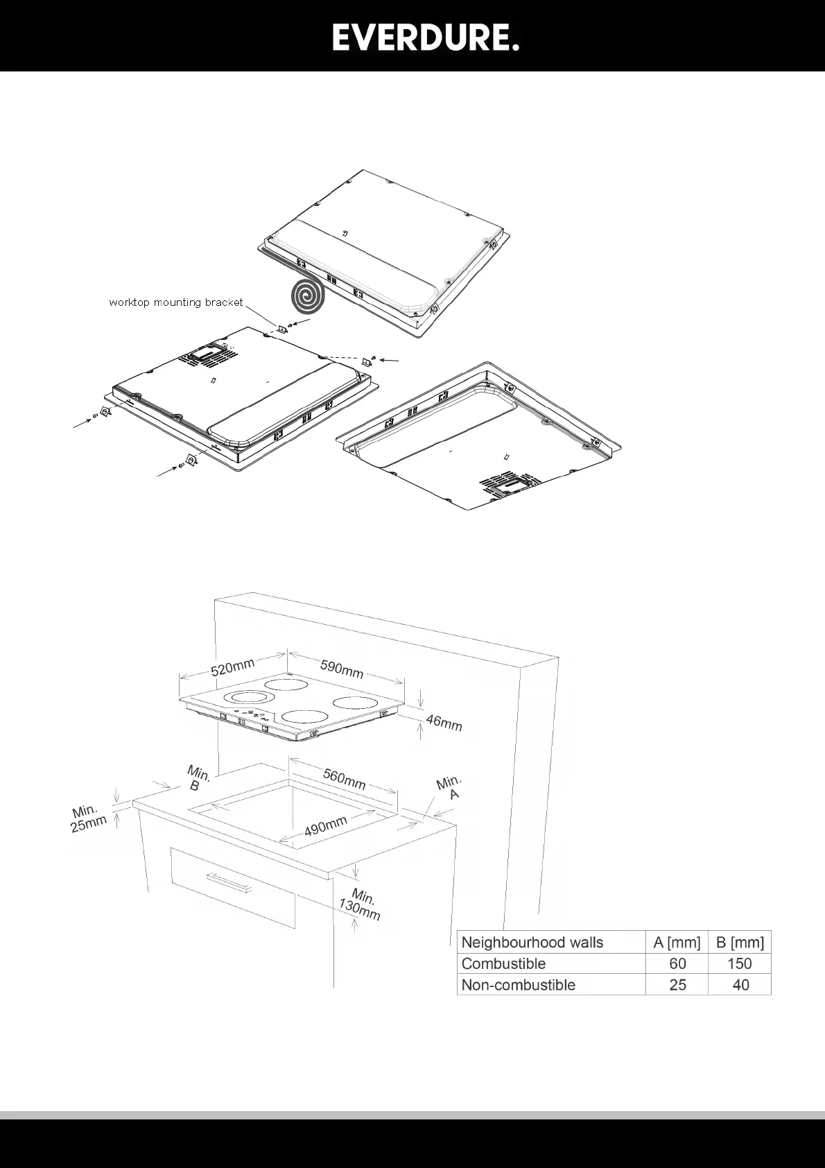 The bottom of the cooktop reaches temperatures above 95°C. A board must be placed a minimum of