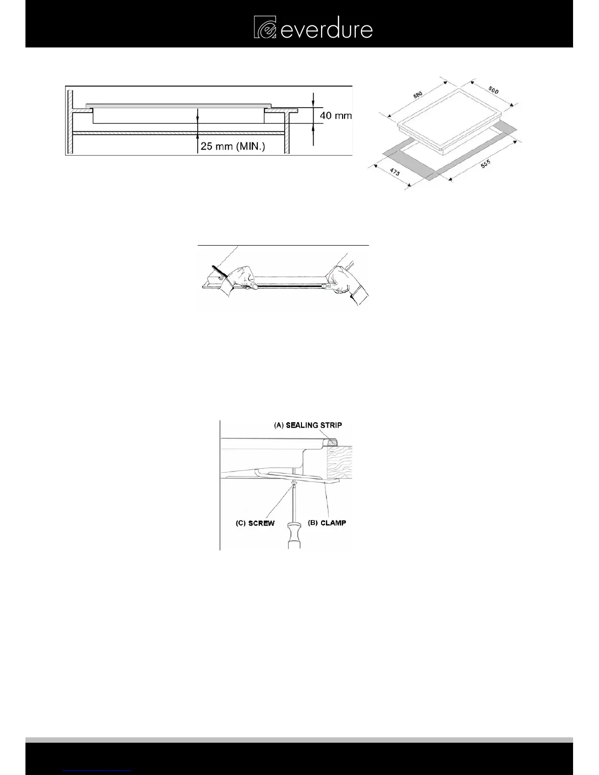 corner of the hob. Slightly tighten a screw (C) through the clamp (B) so that the clamp is attached to the hob,
