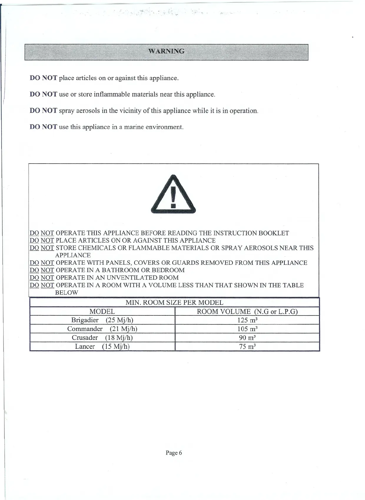 DO NOT OPERATE IN A ROOM WITH A VOLUME LESS THAN THAT SHOWN IN THE TABLE