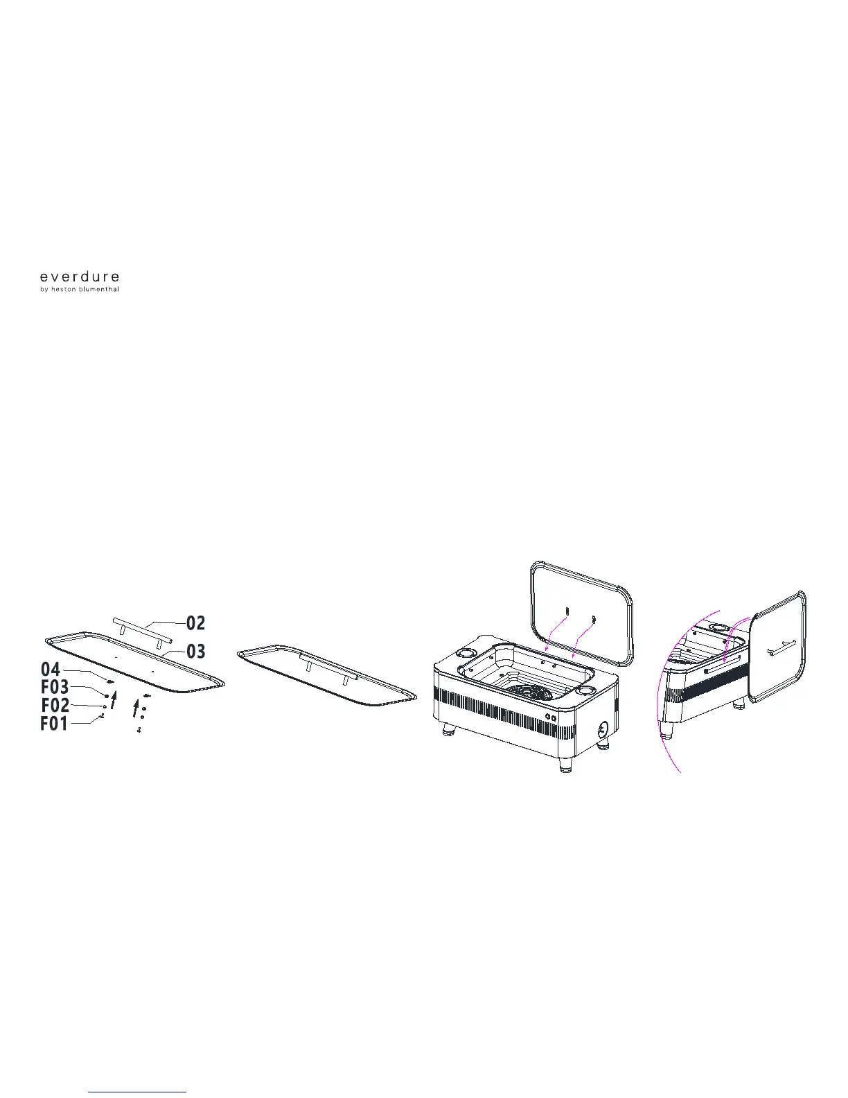 (8mm) screws (F01) (the legs of the brackets should hang around the screw heads). Place the handle (02) on the inset side of the lid (03) and align the handle legs with the two