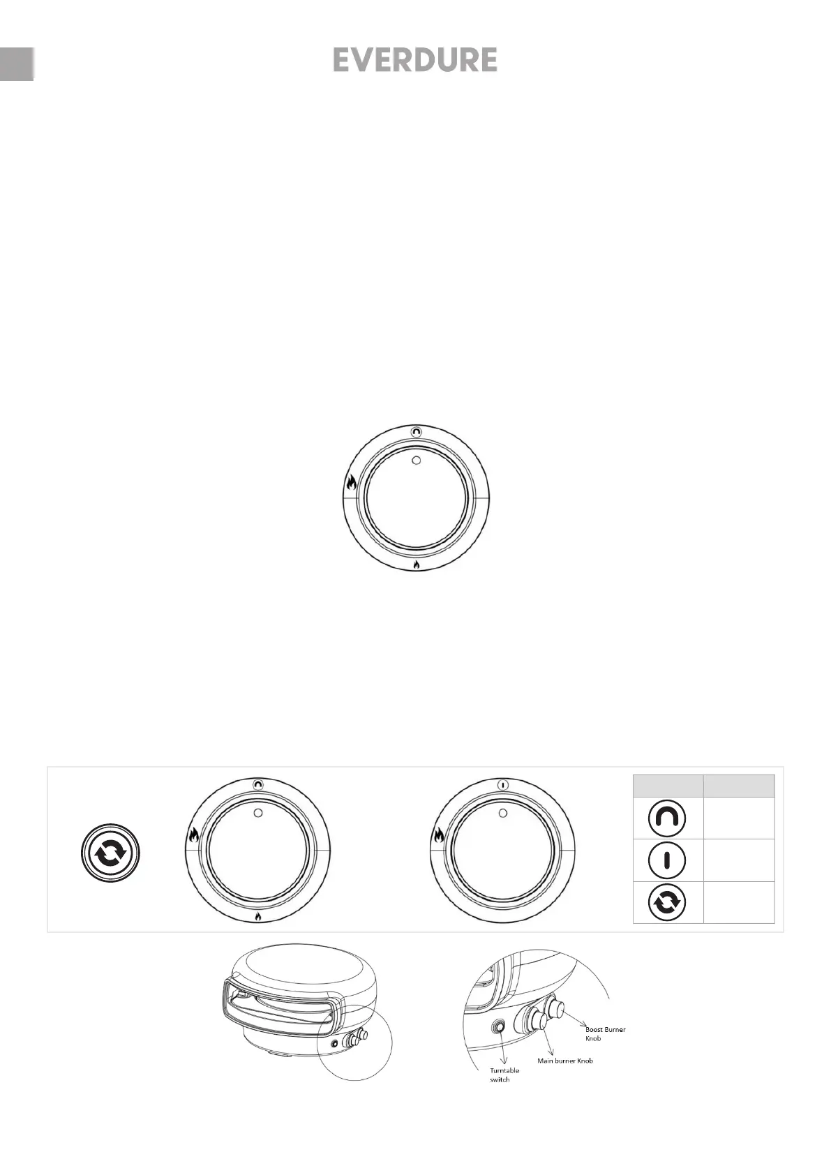 10 seconds after ignition, then release. Set the burner to your desired requirement. Press the button for the turntable