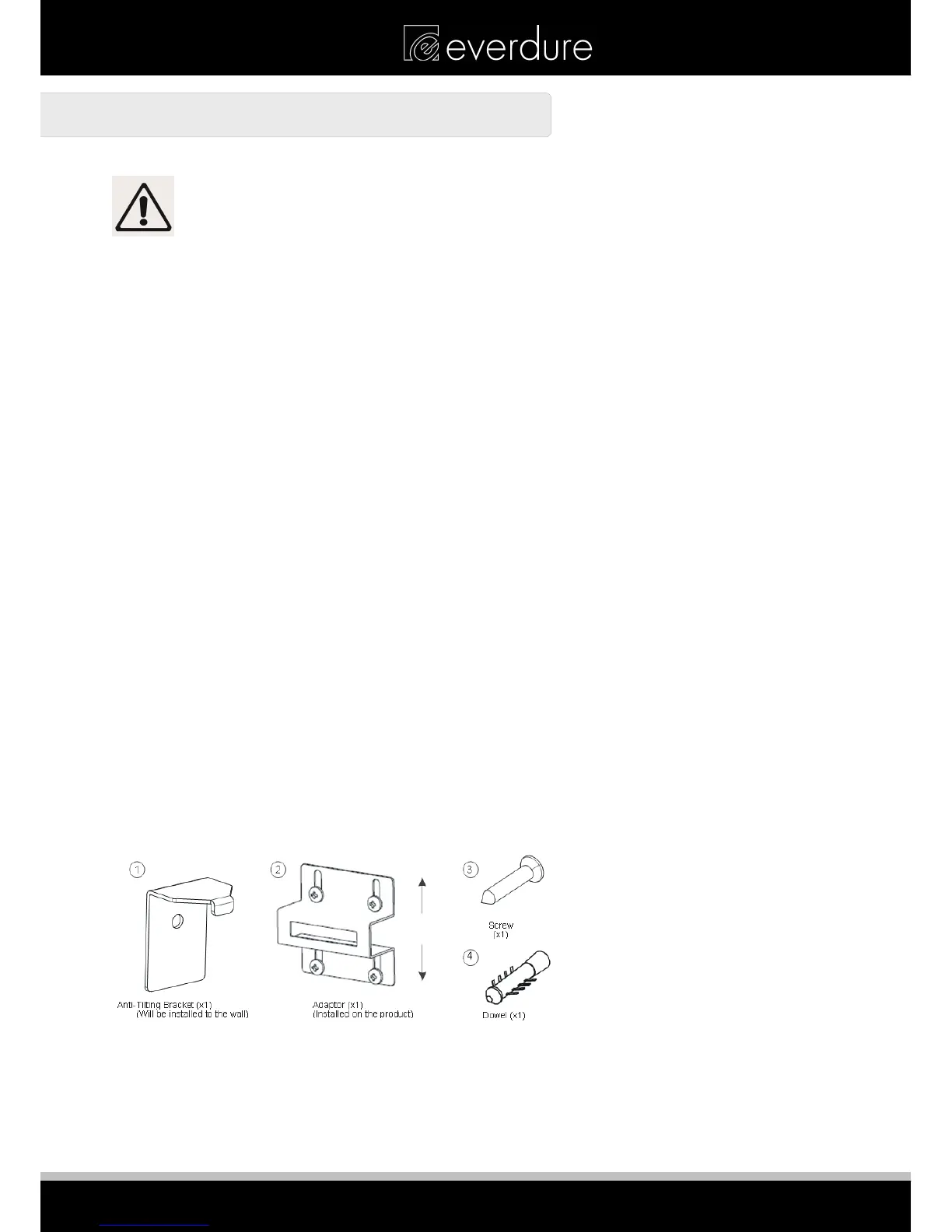 The document bag contains an anti-tilting kit. Anti-tilting bracket (1) should be removed from the kit and