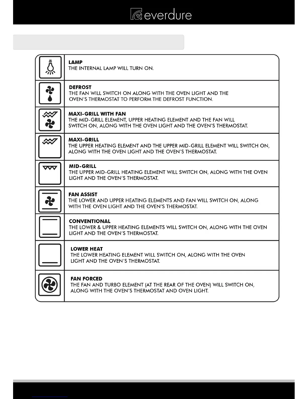 Everdure UFGS69 - OVEN FUNCTION CHART SUMMARY
