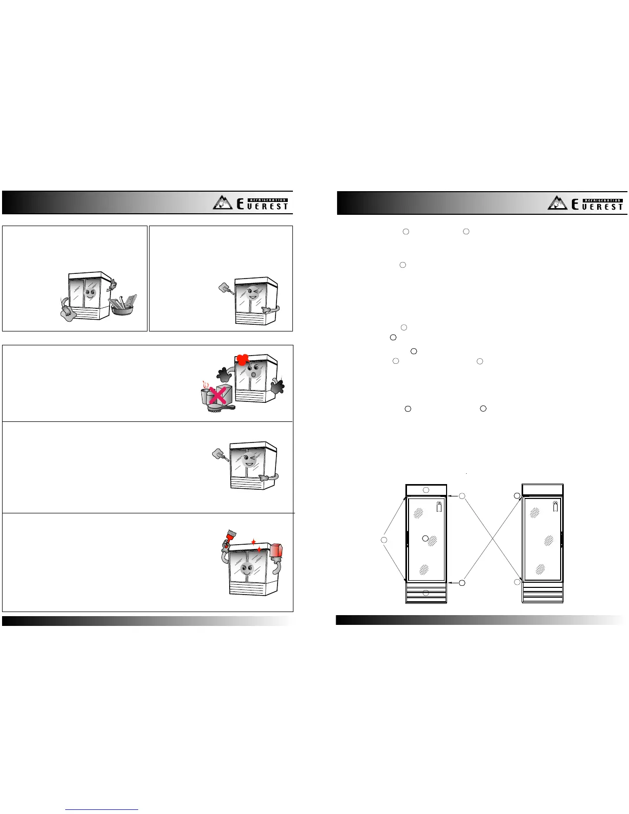 1.The front top signboard and front bottom grill must be removed to access the door hinge mounting screws.