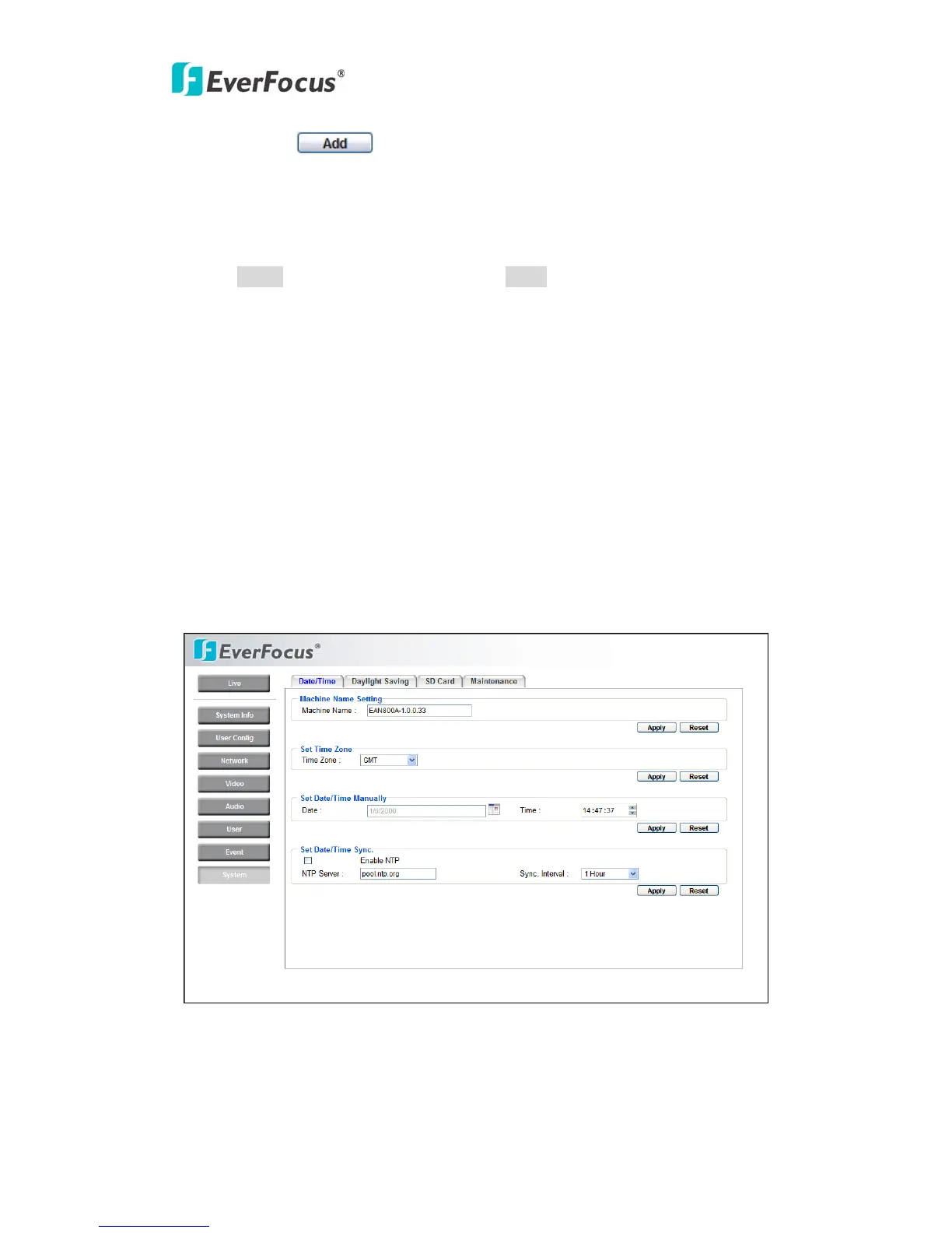 Press Apply to apply the setting changes or Reset to reset without saving the