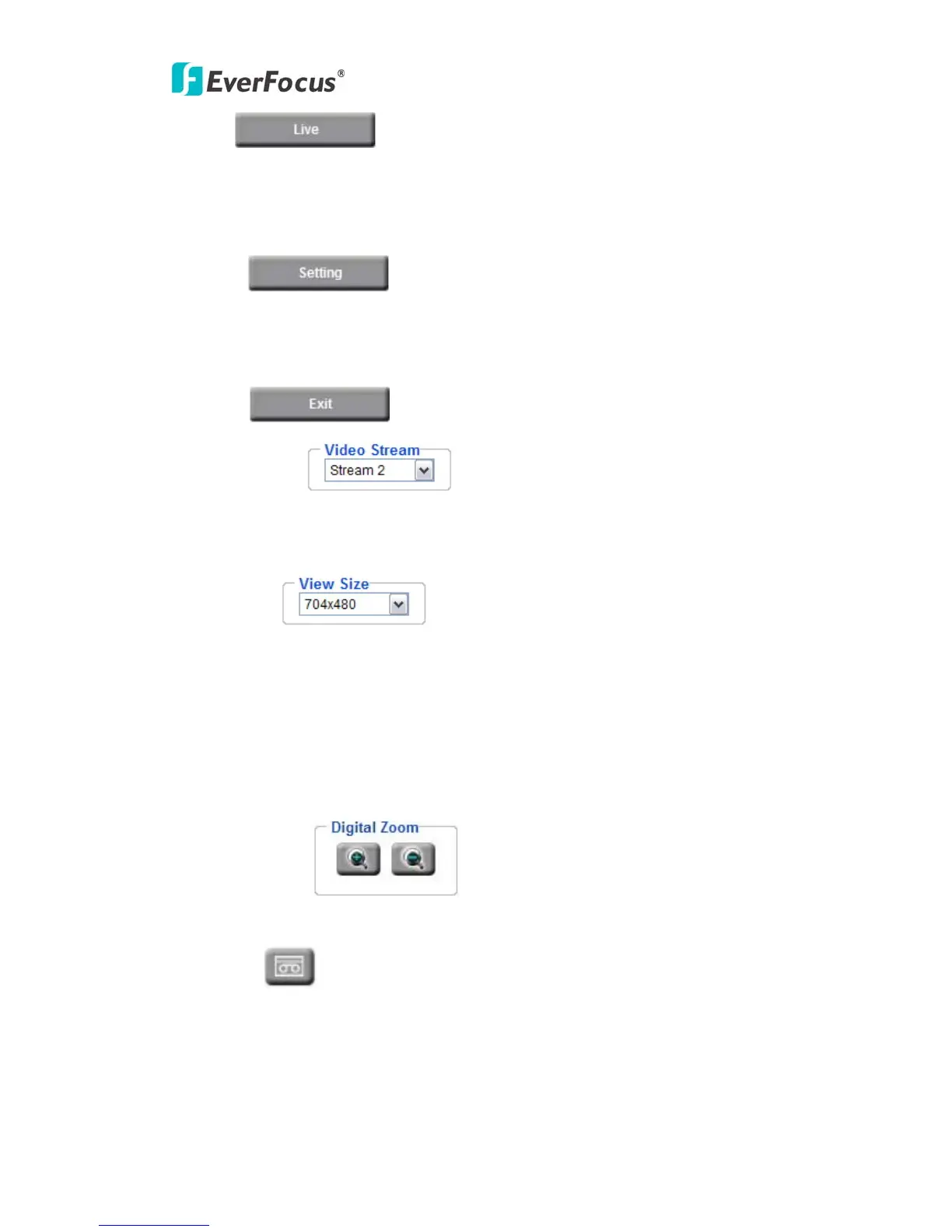 The record button is used to record the current video stream. The location where the