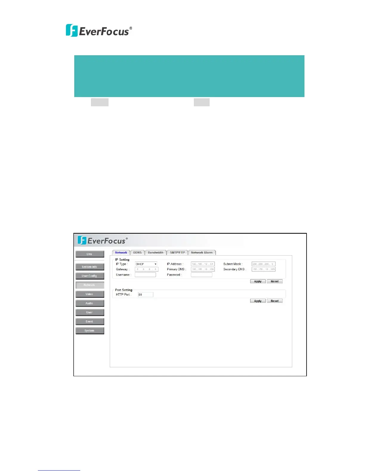 The network settings and the settings relating to Network, DDNS, Bandwidth,