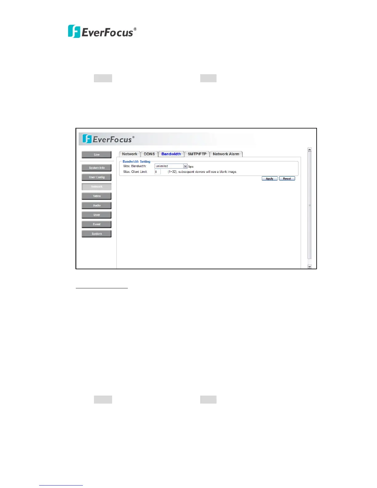 Press Apply to apply the setting changes or Reset to reset without saving the