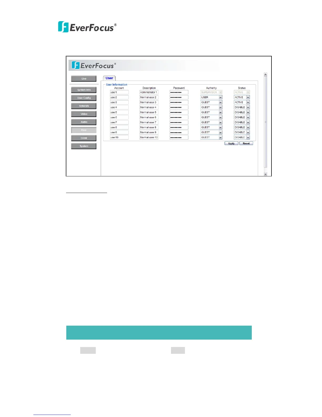 Maximum 10 users can be set for using the IP camera. The user information