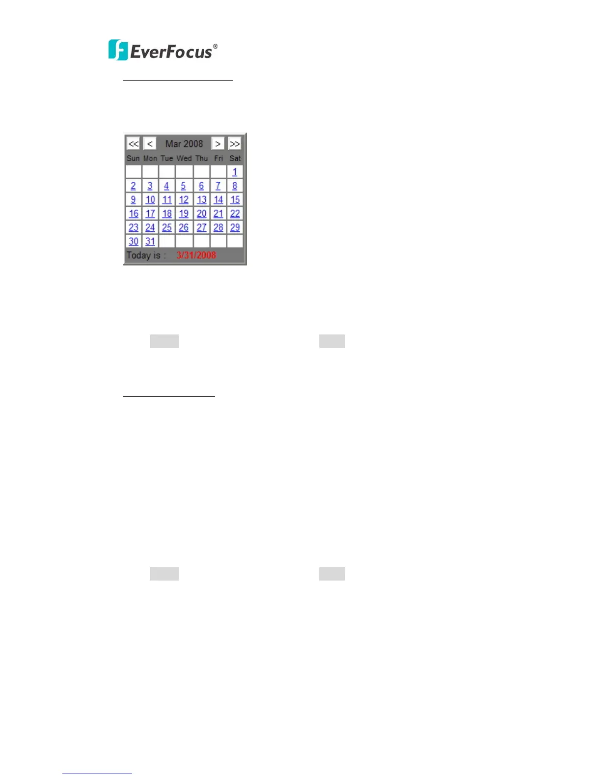 Date: Click the calendar and pick the date. Press << to go previous year, < to go