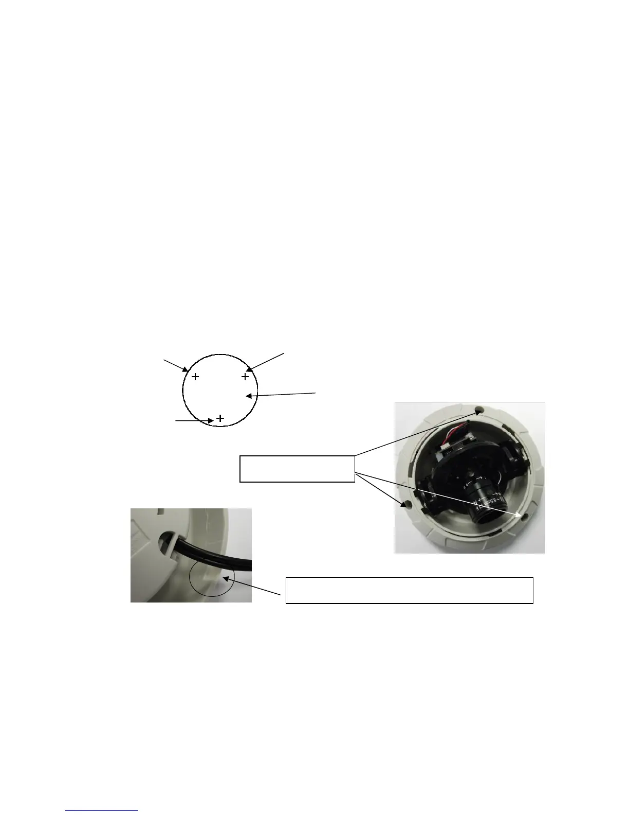 3. Drill 3 or 4 holes, 3 for mounting screws A, B and C, 1 for power/video cable if wires