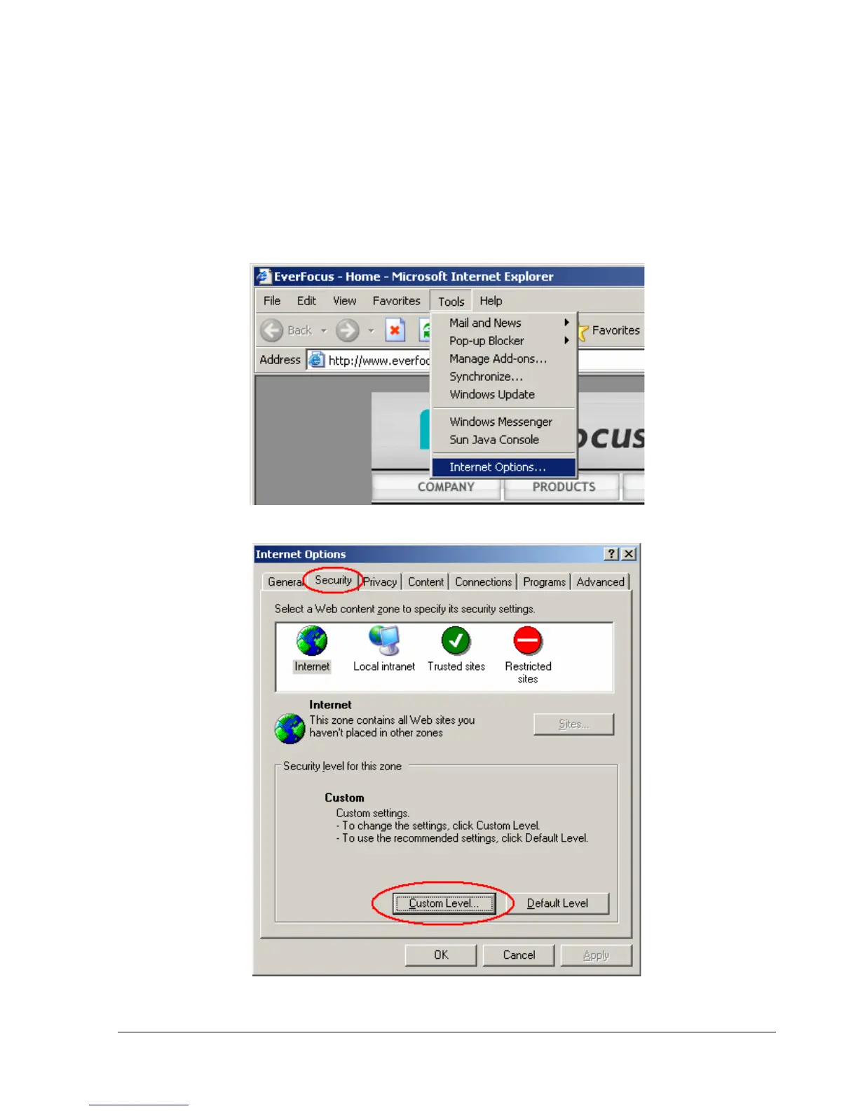 Click the Security tab at the top of the window, then choose Custom Level near the bottom.