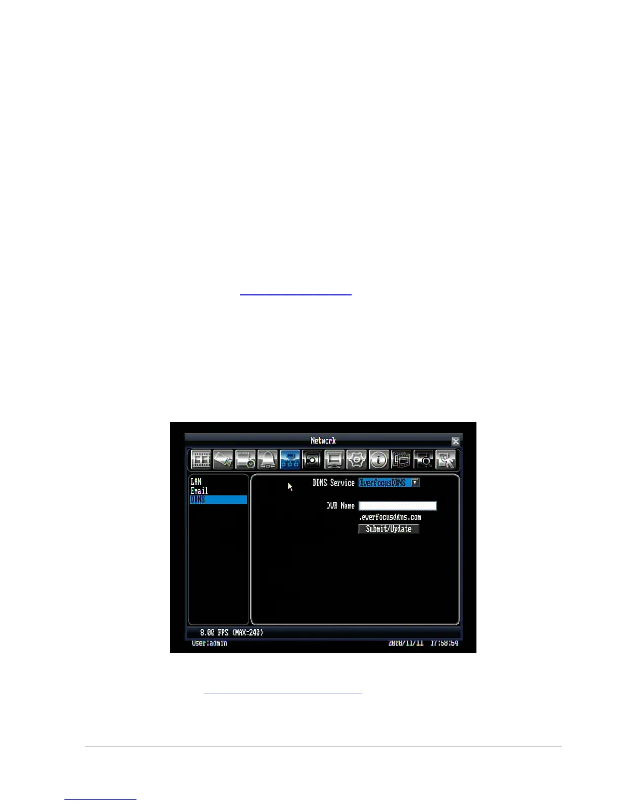 Step 3. In DVR’s Network Menu, go to DDNS. Choose “EverfocusDDNS” for the Server and put in