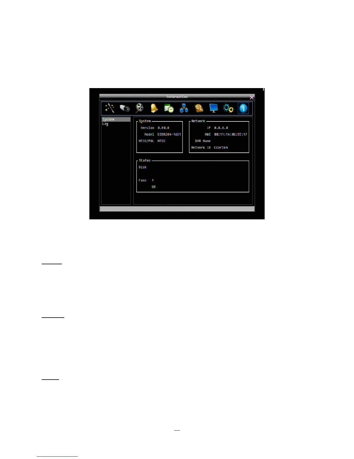 Disk: Displays status of the installed disk(s); normal disk operation is indicated by “OK”.