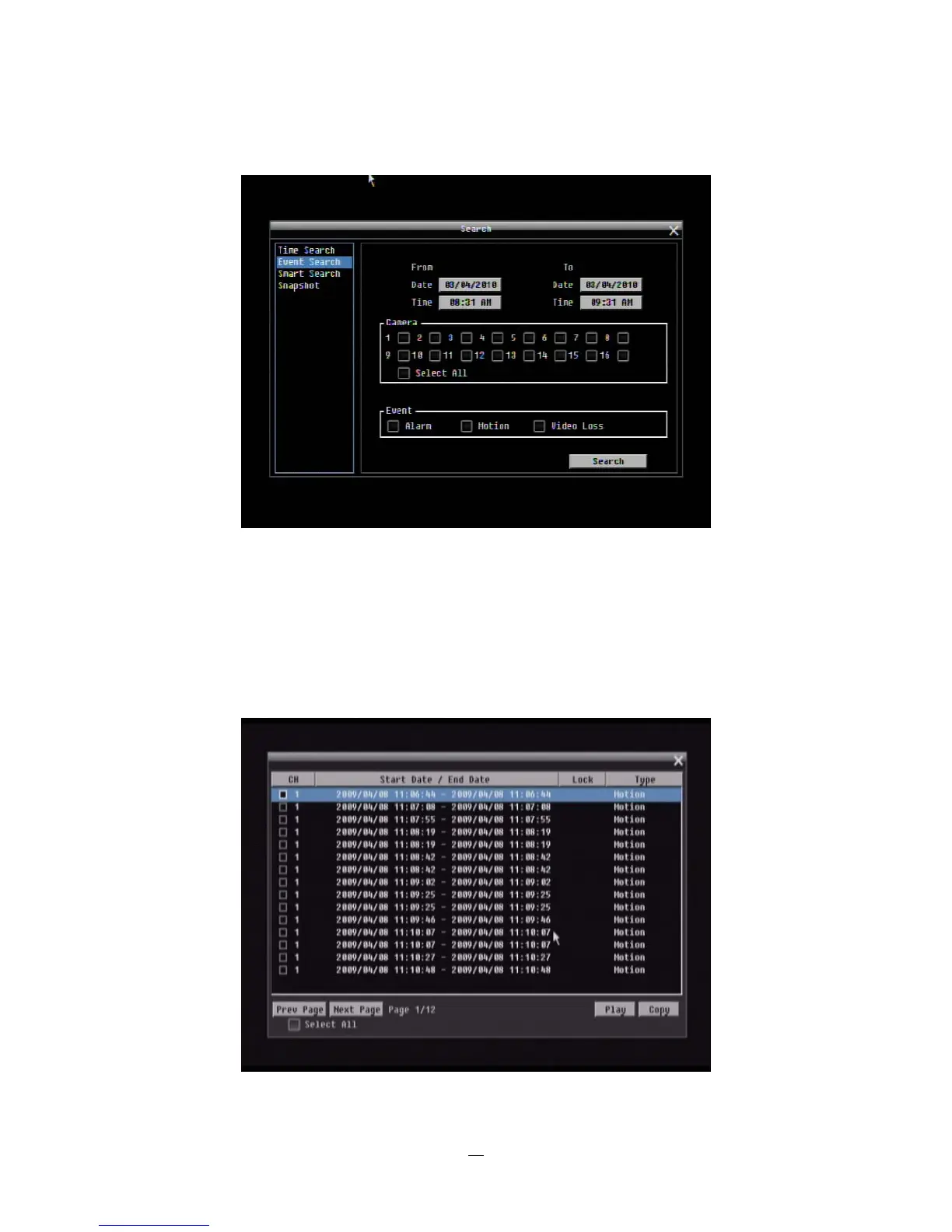 Event: Select which event type(s) to search for. Choose from Alarm, Motion or Video Loss.