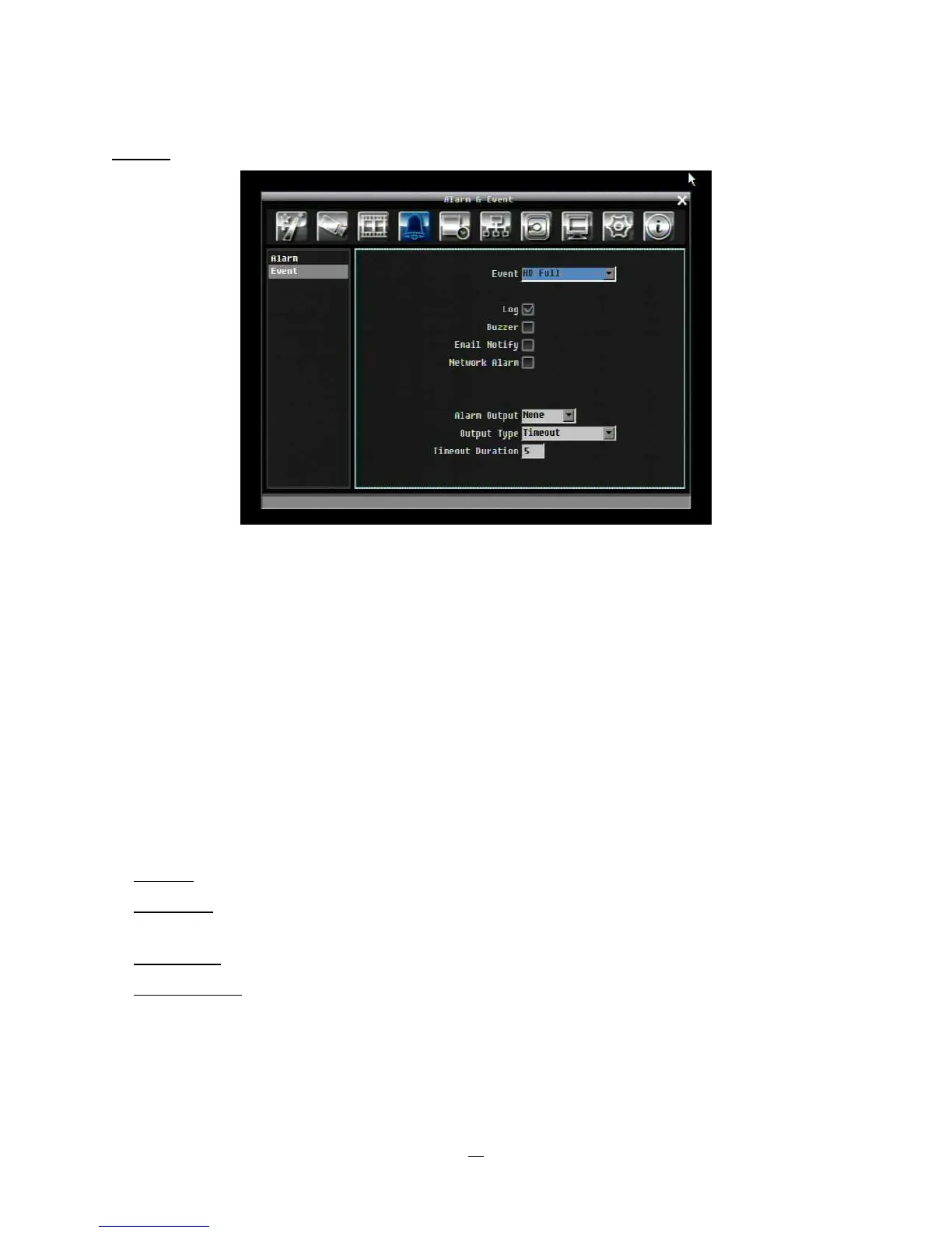 Alarm Output: This will transmit a signal through the alarm output. It can be set to either “NONE” (not