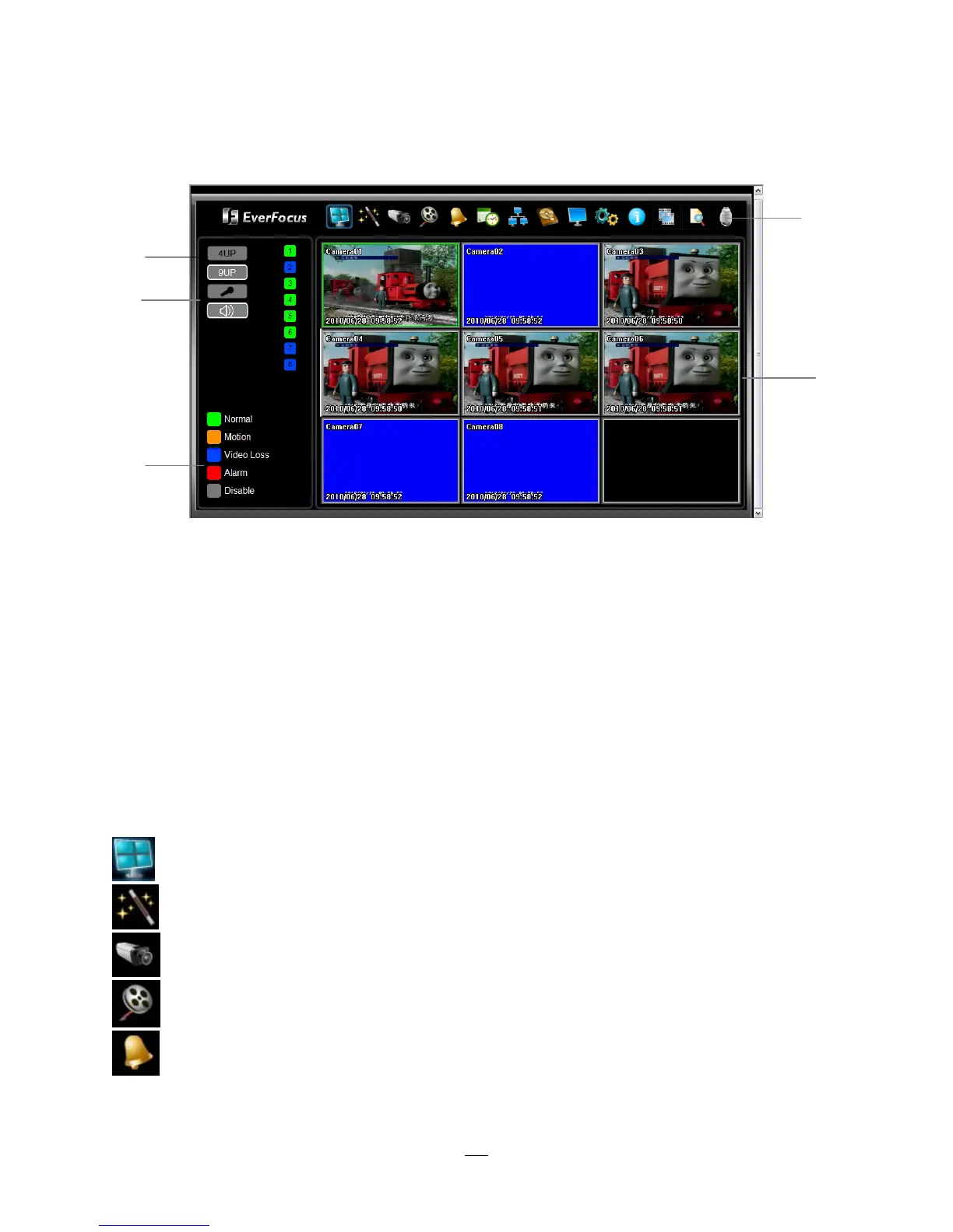 means normal; orange indicates a Motion alarm; blue indicates Video Loss, red indicates an alarm