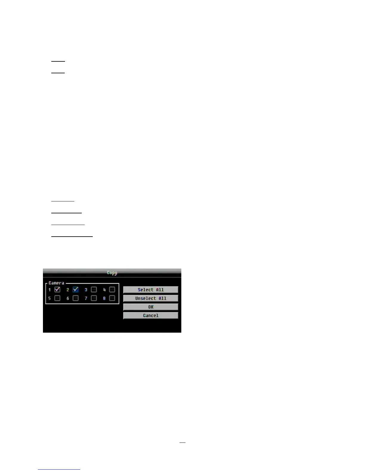 wish to copy to. "Select All" selects all cameras, “Unselect All” deselects all cameras. Click “OK” to copy the
