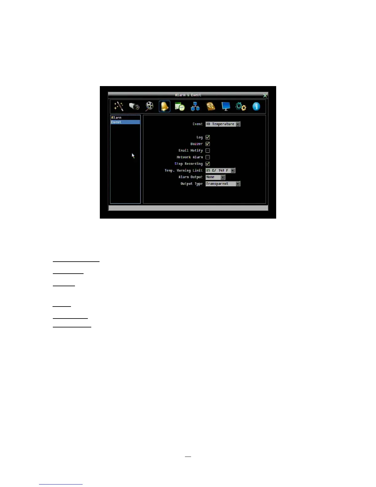 : If HDDs are switched off or are removed, the DVR will create an HD OFF event.