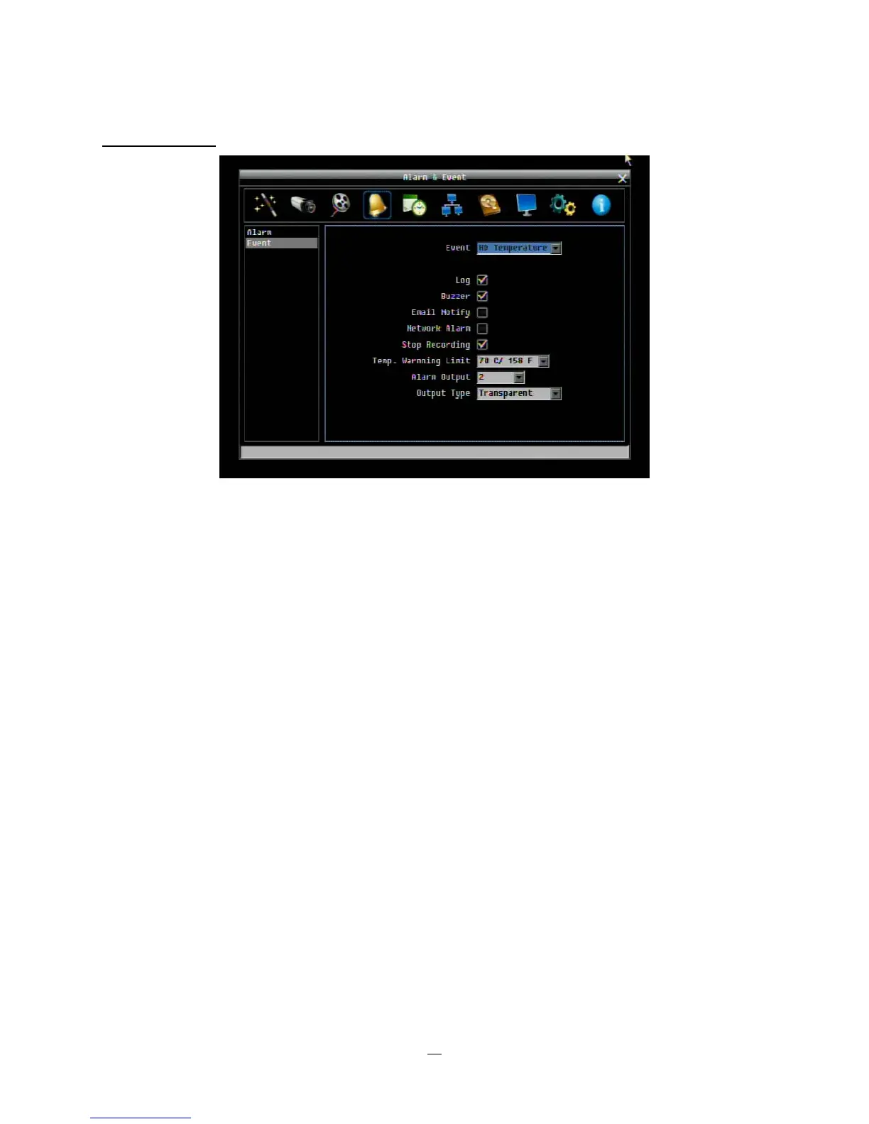 Figure 4-12 Alarm & Event Menu – Event - HD Temperature
