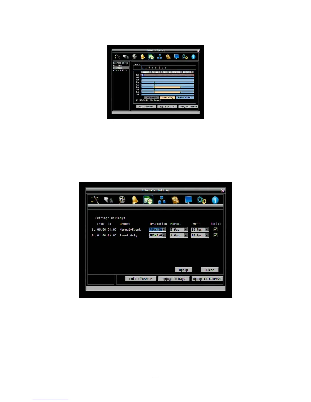 7. Changing recording mode (color) of a timezone: Use Right/Left arrow key to switch to the first block