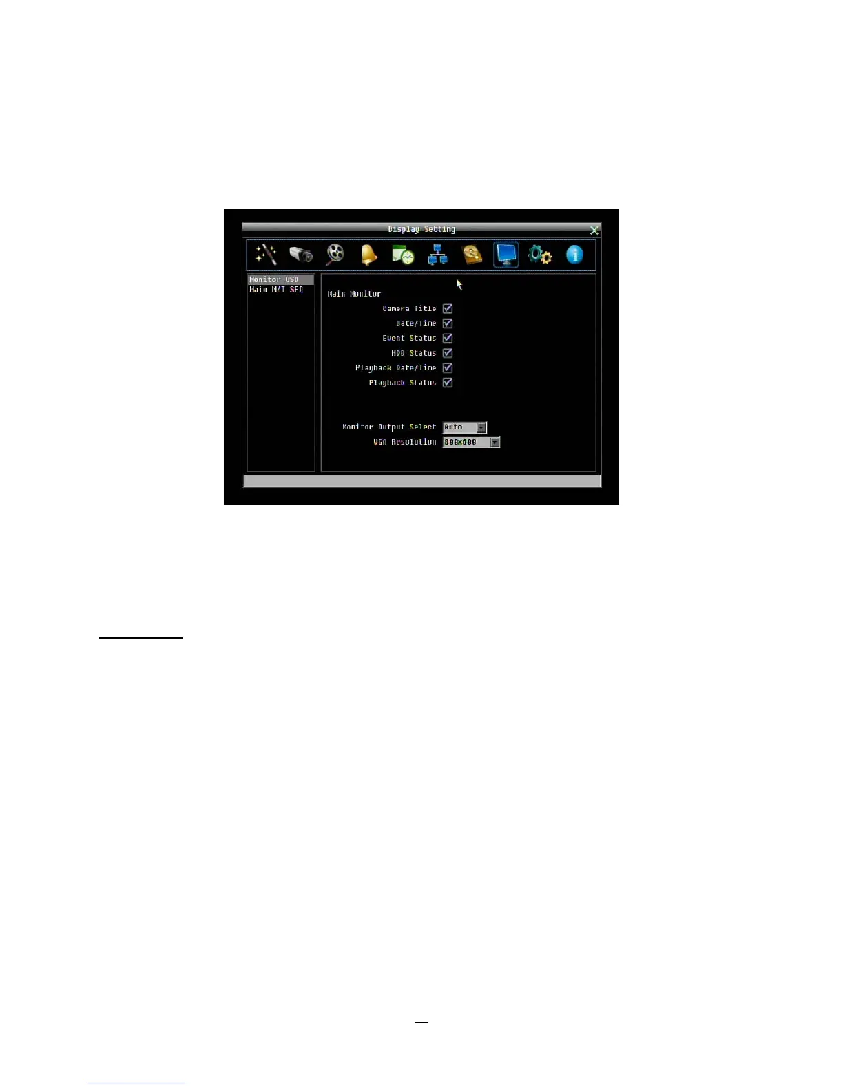 Monitor Output Select: This system supports either VGA or BNC main monitor display, but not both at