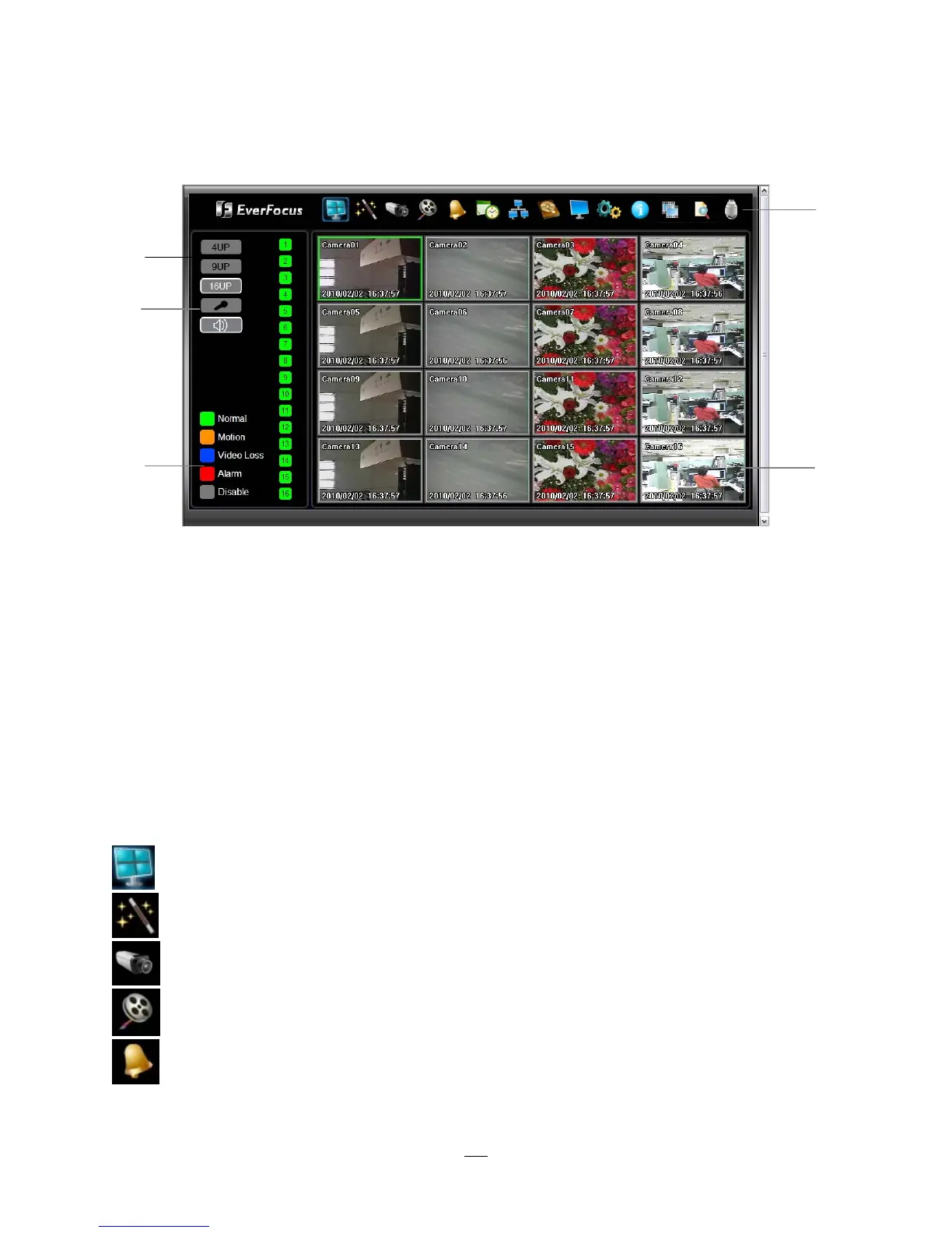 means normal; orange indicates a Motion alarm; blue indicates Video Loss, red indicates an alarm