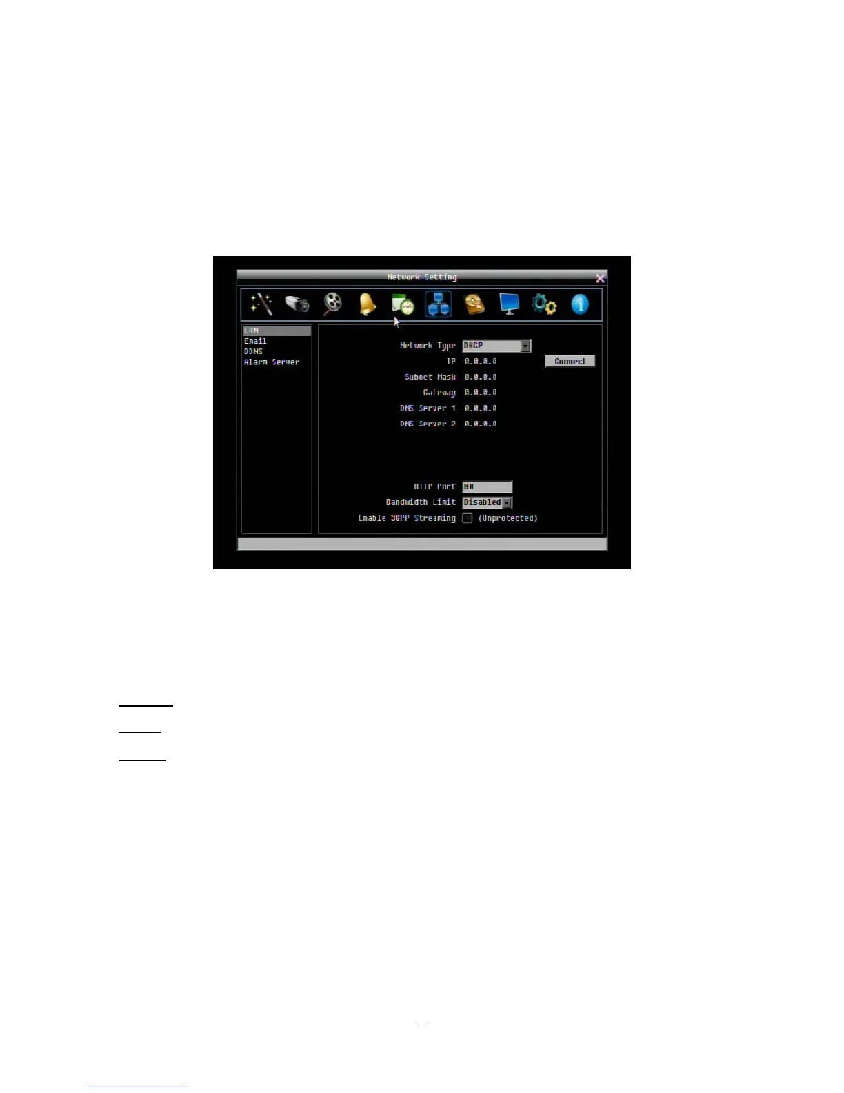 IP: This field shows the DVR’s current IP Address. A static IP address must be set manually. If DHCP or