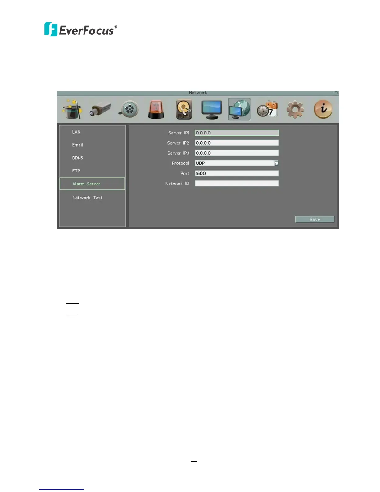 Server IP1~3: IP address of client PC. The network alarm can be transmitted to up to 3