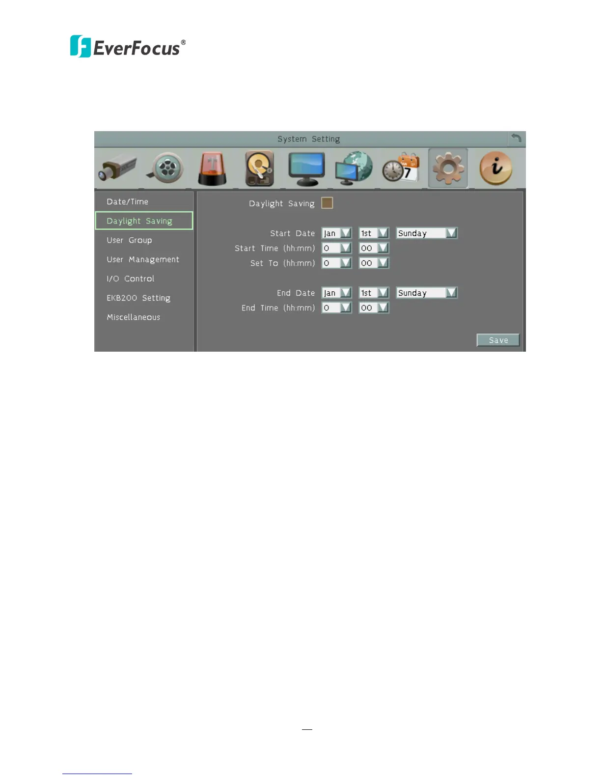End Time (hh:mm): Set the time when daylight saving time ends.