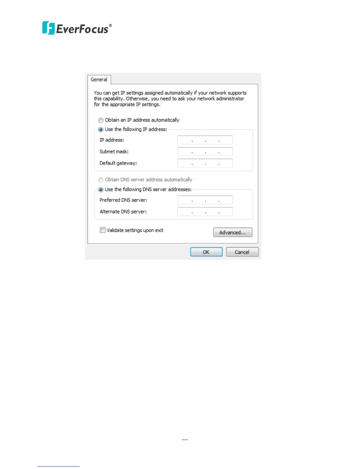 Select Use the following IP address. Assign an IP address of 192.168.1.2, a Subnet