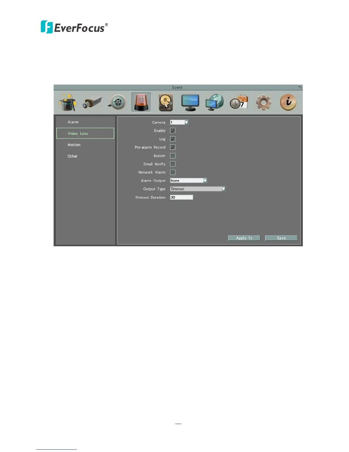 Enable: Check the box to enable the Video Loss event settings for the selected camera.