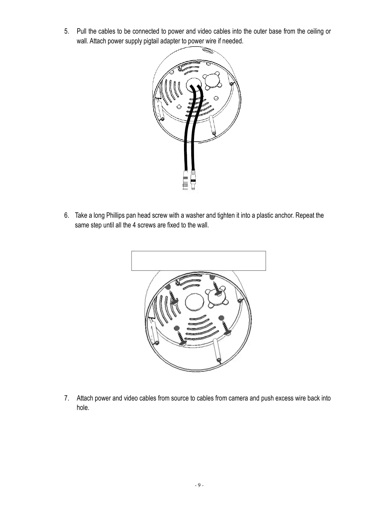 5. Pull the cables to be connected to power and video cables into the outer base from the ceiling or