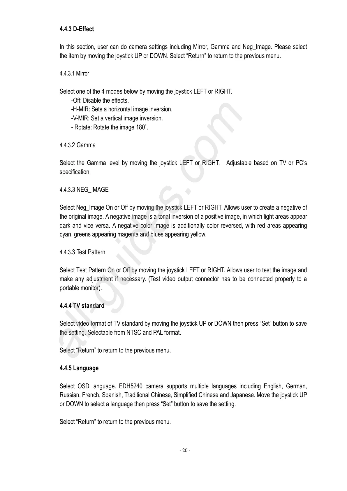 Select OSD language. EDH5240 camera supports multiple languages including English, German,